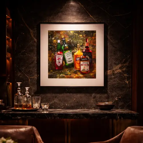Vintage Assembly presents a composed still life where richly layered textures and deep color create a sense of indulgent refinement. The arrangement celebrates glass and form with a confident, collected aesthetic rather than excess. Designed for contemporary interiors, this artwork brings character, warmth, and a quietly sophisticated presence to the space.